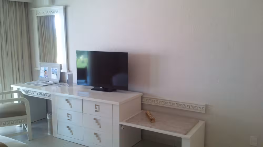 Rooms are equipped with air conditioning, central heating and a fan. Guests can relax and enjoy partial sea views from the balcony or private terrace of some rooms. Many units feature a sea view, which creates a particularly lovely ambience. Rooms have a double bed or a king-size bed. Children's beds and extra beds can be requested for younger guests. A safe, a minibar and a desk are also available. Guests will also find a tea/coffee station included among the standard features. Further amenities include an ironing set and a trouser press. A direct dial telephone, a flatscreen television with cable channels, a radio, an alarm clock and WiFi (no extra charge) provide all the essentials for a comfortable holiday. Bathrooms are equipped with a shower, a bathtub and a whirlpool bath. A hairdryer and a vanity mirror are available for daily use. For extra comfort in the bathrooms, guests are offered cosmetic products. Guests can also book wheelchair-friendly rooms with wheelchair-accessible bathrooms. The resort has family rooms, non-smoking rooms and smoking rooms.
